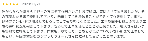 信頼できる口コミは、「仕上がりが綺麗だった」だけでなく、施工中の説明や対応の丁寧さ、安心して任せられたかといった “過程の満足度” にも触れています。